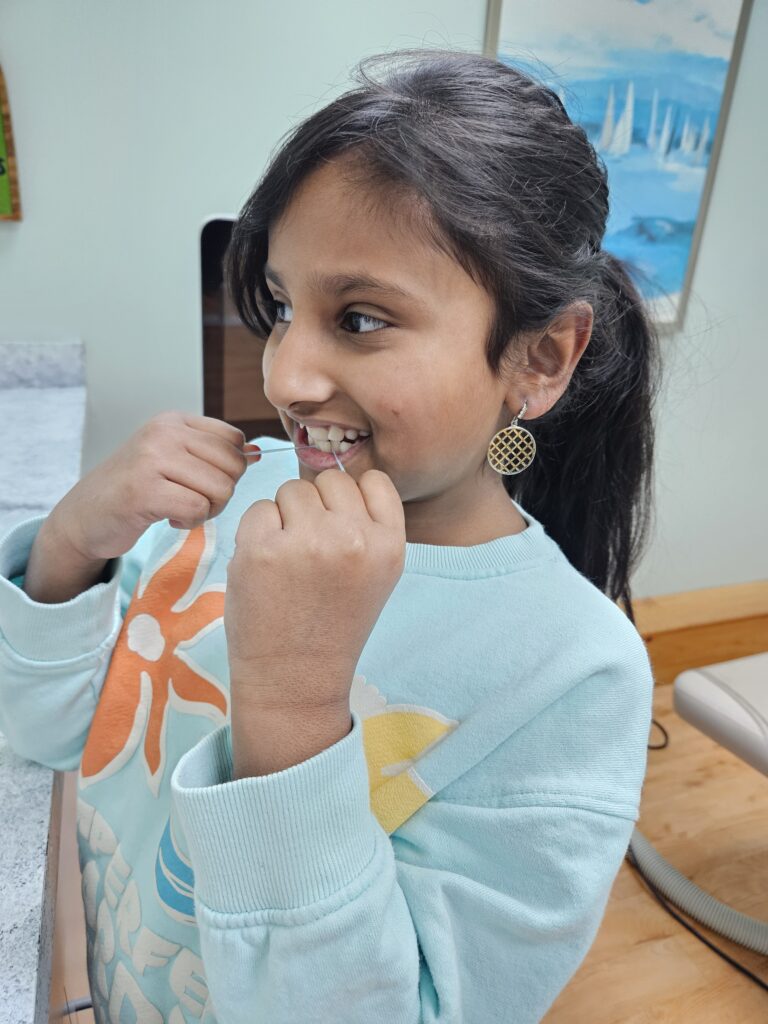 If you’re having trouble with regular floss, try using the floss picks. They can be more kid-friendly, and they come in different shapes, colors, and flavors to make them fun!
